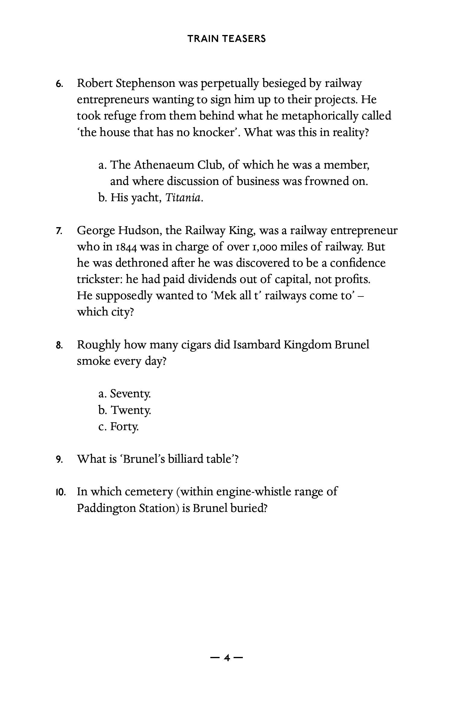 When was smoking banned on trains? Which actor restored kippers to the menu of the Brighton Belle? What regular lineside event did Dickens describe as 'a shave in the air'? Perfect for a trivia night or a long trip, Train Teasers will both test your knowledge of this country's rail system and enlighten you on the most colourful aspects of its long history. Meet trunk murderers, trainspotters, haters of railways, railway writers, Ministers for Transport good and bad, railway cats, dogs and a railway penguin. [shortcode] [short-description]