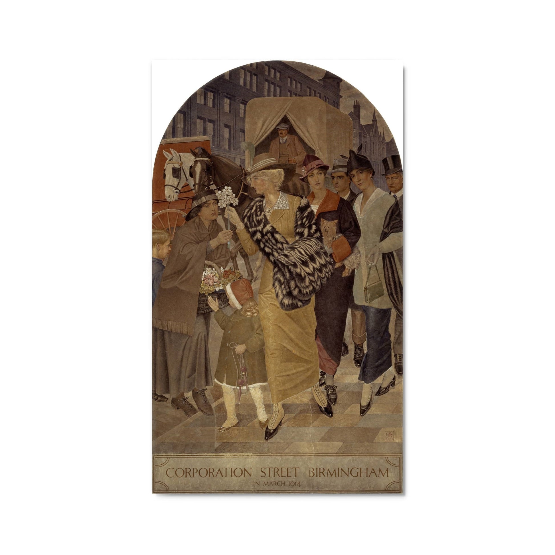 This postcard depicts Corporation Street, a fresco painted on the wall at the top of the staircase at the entrance of display at Birmingham Museum & Art Gallery. [shortcode] [short-description]