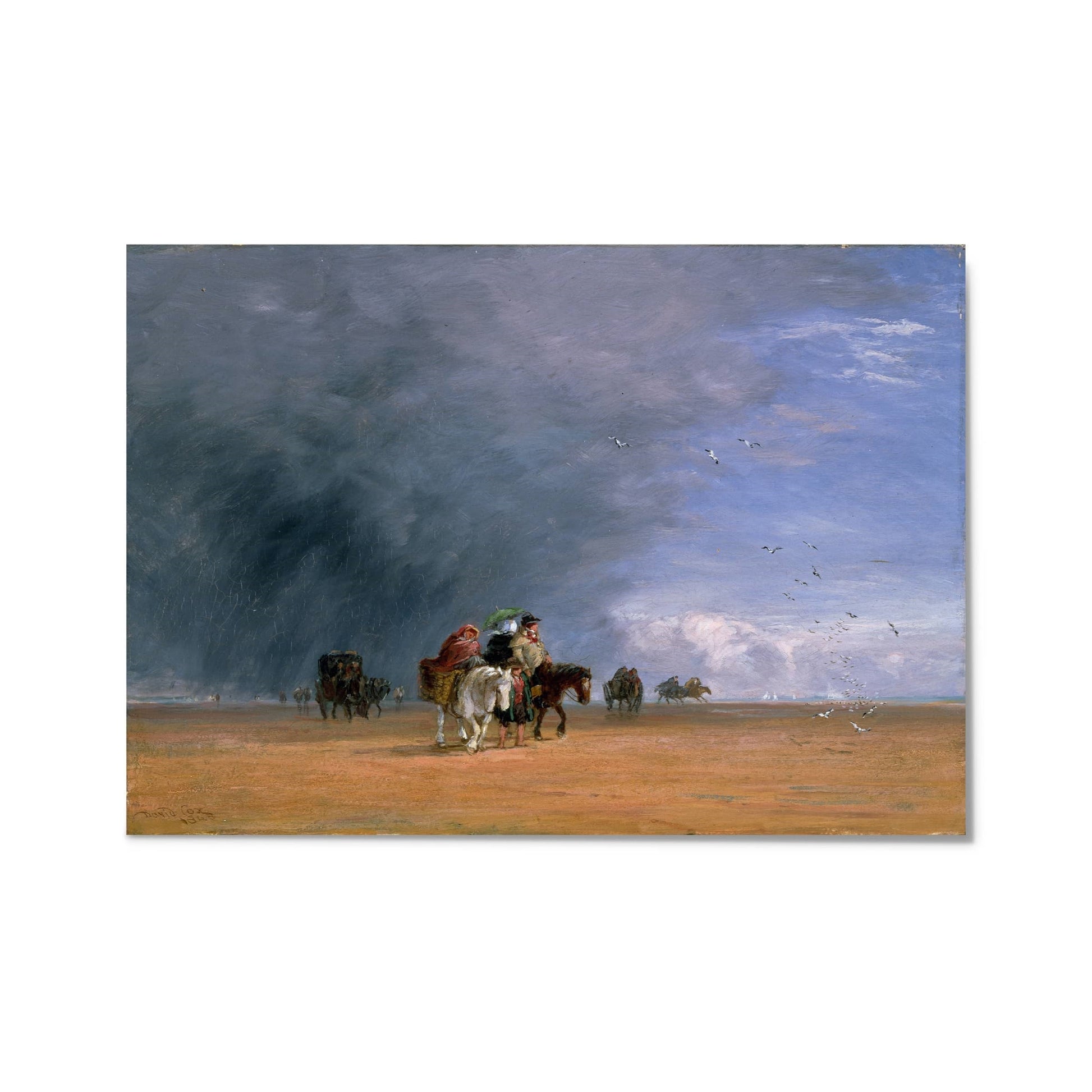 This postcard depicts Crossing the Sands. Crossing the sands could save a traveller many hours but the trip could be very dangerous without a guide, as is reflected in this dramatic oil painting. David Cox came to oil painting late in his career, when he was already established as one of the leading watercolourists of his day. This artwork was presented by Frederick Nettlefold in accordance with the wishes of his brother, the late Joseph Henry Nettlefold in1882. [shortcode] [short-description]