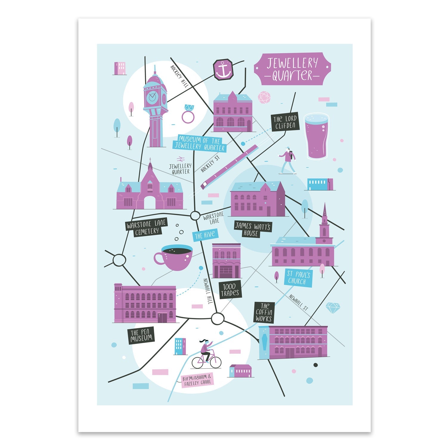 Brighten your walls with this colourful graphic map print by local creative Tom Woolley. Featuring iconic landmarks around the Jewellery Quarter including Museum of the Jewellery Quarter, The Coffin Works and Chamberlain Clock, this print shows off the best of the Jewellery Quarter [shortcode][short-description]