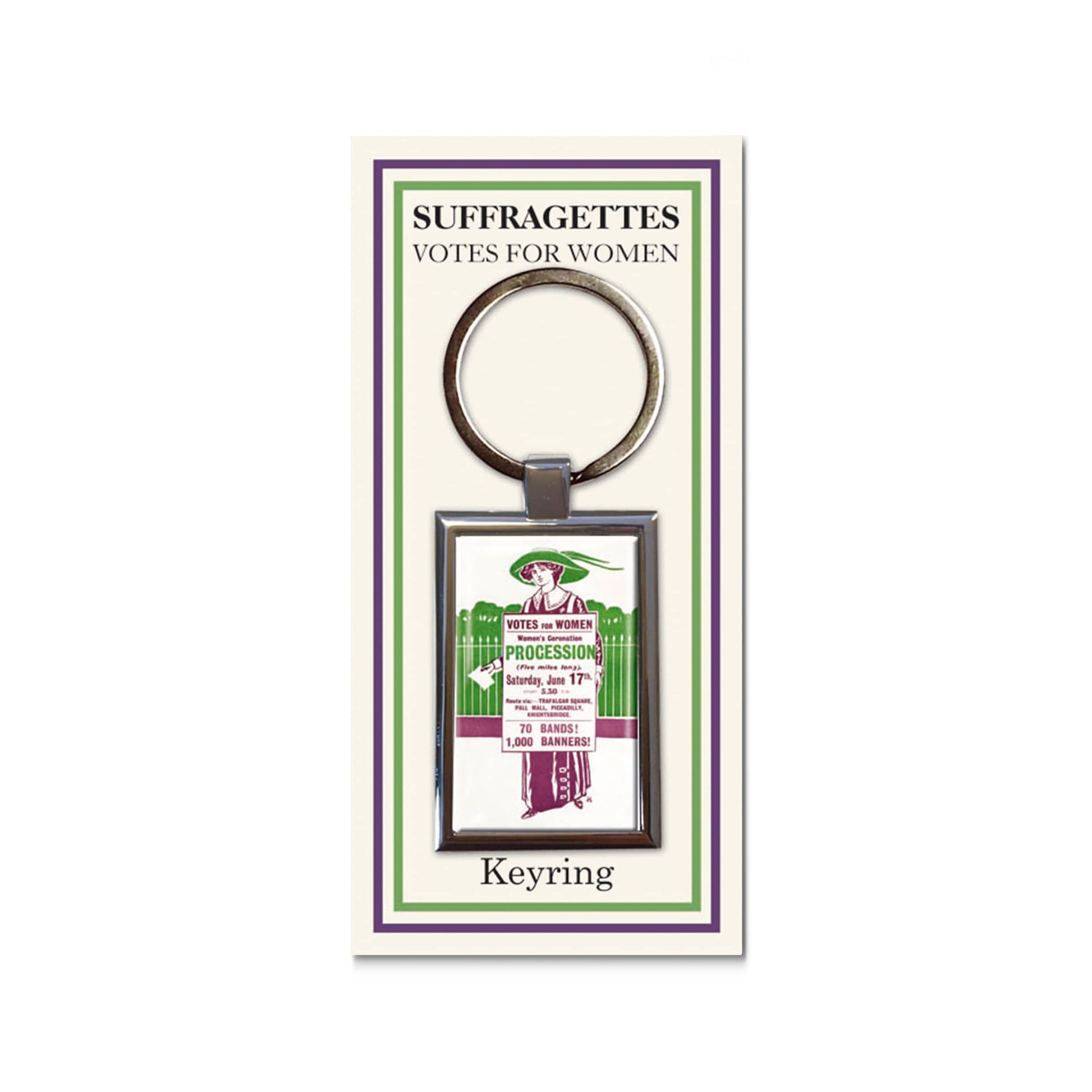 A quality, eyecatching keyring inspired by the Suffragettes. Made to last, this keyring features a metal base and a hardwearing resin surface. An excellent addition to any set of keys. [shortcode] [short-description]