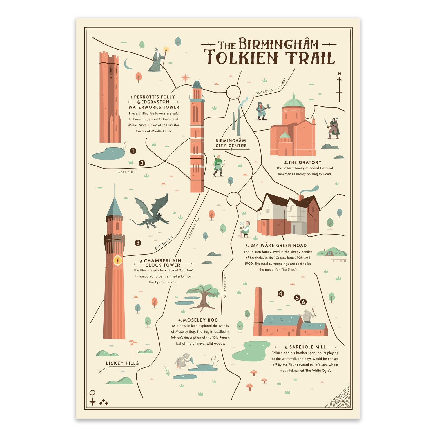 Brighten your walls with this colourful graphic map print by local creative Tom Woolley, inspired by JRR Tolkien's life in Birmingham. Featuring iconic landmarks around the city, including Sarehole Mill, this print is perfect for any Tolkien fan. [shortcode][short-description]